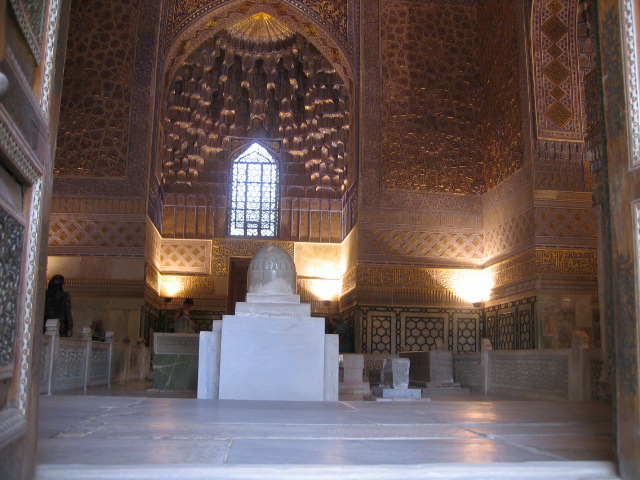 20世紀になって発掘されたチムールの納骨堂。形は十字架型をしている。明遠征の時に没したチムールの遺体はこの堂に納められることはなかった。だから納骨堂には石棺床が横たわっているだけである。この上には廟と追善モスクが建てられていた。