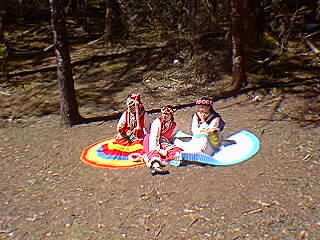 にあった。 写真を一緒に撮るとお金を請求されるしくみである。 日本であれば3000メートルもの高地には木立はないが、緯度が10度ほど下がると標高3200メートルの 雲彩坪は杉木立が茂り草原には馬が放たれていた。 小店が並びイ族の衣装をつけた女達がたむろして客を待っていた。 牧場の向うでは3200メートルの高度を何者ともせず