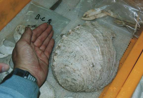 まだ完全に埋め戻されておらず、貝層の断面が見えている