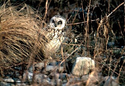 冬の河原にいるアシ原のフクロウ(猛禽)である。