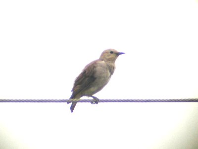 ムクドリの中に混じった頭がクリーム色の小型のムクドリである。