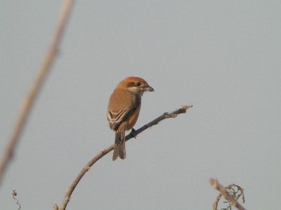 秋になるとキチ、キチと枝の先で鳴き出す茶色っぽい、過眼線が黒い小鳥である。 百舌鳥という漢字での名前が示すようにいろんな声でなく事ができる。 また、「はやにえ」は有名で、枝先にバッタや昆虫、場合によっては、小鳥の死骸まで突き刺して戦利品として飾っている。 時々地面に降りては、枝に飛び上がり、尾っぽを盛んに振ることが特徴である。 夏場には、林の中でピーピーと鳴きながら、親鳥に餌をせがんでいるヒナも見ることができる。 |