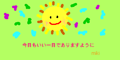 お絵描きBBSアーチスト mikiさん 京都にお住まいのmikiさん シンガーでクラシックギターのレッスンも 本格的に始められました。 練習頑張って下さいね。(^^) 衝撃的な一枚 問題作というか迷画というか・・ 爆弾にもちょっと似てる 記念すべきデビュー作 いつも元気の出る絵有難うございます (^^)