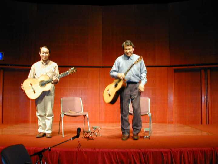 PHOTO1 演奏を終えて苦笑いの串田(向かって右)&渡辺(同左) PHOTO2 発表会終了後演奏者全員(?)のスナップ。司会者がいない・・・(^^;; ***合奏練習風景の写真はHP容量が少ない為、削除させて頂きました*** |