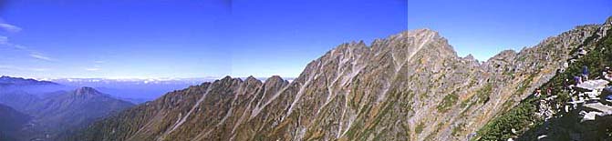 右から紀美子平、そして奥穂への縦走路。正面が奥穂岳。更に左に西穂岳が続く。そして焼岳に続いて後方乗鞍岳
