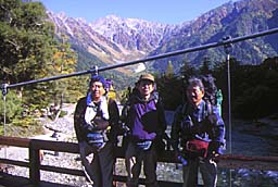 平湯温泉からバスに乗り換え(¥1050)上高地に入る。紅葉も最後の週かもしれないし、連休なので大勢の人でゴッタ返していた。早速登山届を出し、それでも未だ我々三人はのんびりしていた。共に今日の行程は時間タップリあり急ぐ事はなし。