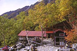深々とした森はやがて明るい潅木帯に変わり、岳沢の広大なガレ場の左側に沿っていく。やがて行く手に岳沢ヒュッテが見えてくる。紅葉したダケカンバやナナカマドが見られ、ヒュッテのテラスから見える上高地は勿論、霞沢岳、焼岳、乗鞍岳が見渡せ、背景には前穂、西穂の荒々しく尖がった峰々とカールが圧巻である。