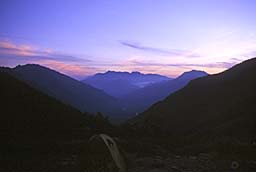 昼食後の夕方までテントでひと寝入り。誠に至福の極みであった。夕焼けの景色も実に素晴らしかった。テントから顔を出せば何時でもその絶景が見られる。明日は快晴だろう。空の色が群青色に変わり月も洸々と輝いている。夕食後また寝た。昨日までの睡眠不足を補うかのように・・・zzzzz(ー_ー)
