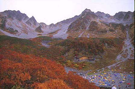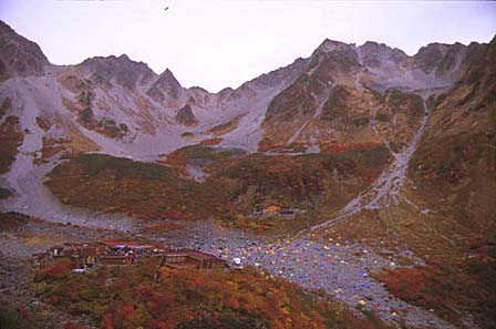 手前涸沢ヒュッテ、真中にテン場、奥が涸沢小屋