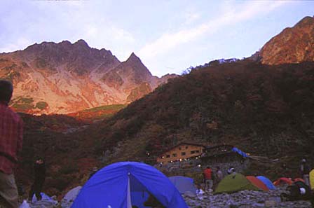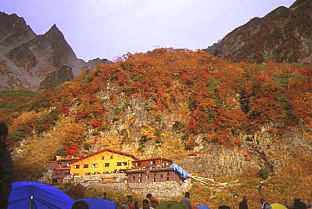 涸沢小屋の紅葉 (右に北穂への登り口)