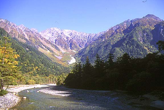 梓川と前穂高を正面に、左に西穂高、右に明神岳