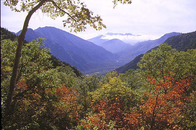 正面真下に上高地。手前左に霞沢岳、正面後方に乗鞍岳、そして右に焼岳が見える。