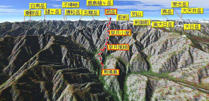 標高2600m、早月川から剣岳を見た展望図。赤枠の文字をクリックすると実際の写真が出てきます。
