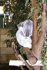 | 木にしがみつきながら眠っている。 夜行性動物だから。 コアラは、「水を飲まない」という意味。 これは、動きが緩慢なので、地上に 降りて水を飲むという行為は非常に 危険を伴うために、水を飲まないという 説。 又は、主食にしているユーカリは低 カロリーなので、なるべくエネルギー を消耗しないようにしていると云う説。 |