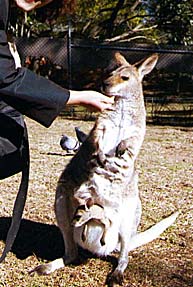 目がとても愛らしいカンガルー。 子供も下から顔を出しているよ(^^) カンガルーとは、「知らないと」いう言葉。 アメリカ人があの動物の名前はと現地アボリジニ人に聞いたが、言葉が解らないので、知らないと云ったのが事の由来。 |