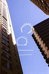 ビルの谷間に飛行機雲が