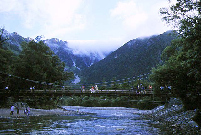 河童橋から明神岳を望む。下を流れる川は梓川。