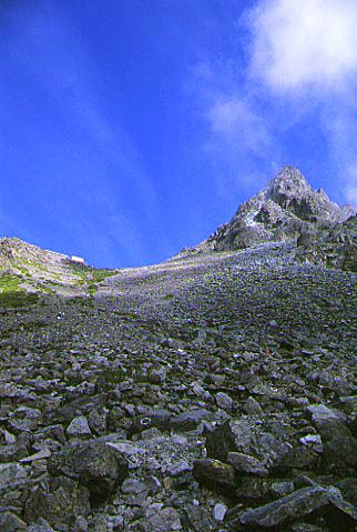 左上に小さく見えるのが、槍ヶ岳山荘。その下を登る登山客も。真近に見えそうな感じがするが、どうしてどうして結構あるよ〜(^^)