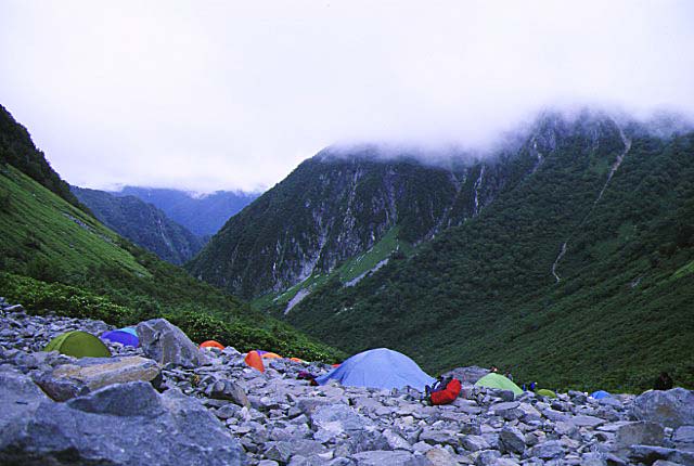 涸沢キャンプ地より後方歩いてきたルート及び屏風の頭を望む