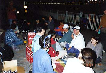 サポート隊と一緒に喜びを分かち合う。後方が宝来橋の明かり