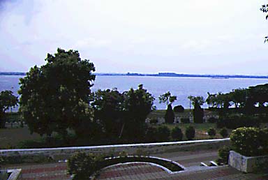 ジョホール水道と向こうに見える島がシンガポール。寺院より撮影