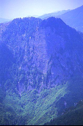 釈迦ヶ岳山頂から、300mm望遠カメラで写した七面山の垂直岩壁。クライマーならそそられそうな高度感あり。 その高さ200〜300mの絶壁。但しここまでのアプローチを考えれば、少し・・・・・。