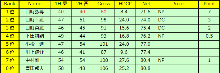 最低人数8人でのコンペ、制したのは目時幸雄さんでした。6年振りの優勝、おめでとうございます。いいハンデキャップ貰えましたね!運も腕のうちです。菅さんも1年振りに参加してくれました。