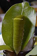 アオスジアゲハは、終齢幼虫でも色が同じなので、よくわかりませんが、大きさから言って、終齢幼虫になったと思われます。ヤマトシジミは、今日はなかなか見つからず、1匹机の上に落ちていたのを見つけ、葉の上に戻しました。蛹化の場所を探していたのでしょうか? アゲハ(クロアゲハ)は、昨日から蛹化の場所を探していたのですが、よりによって、カラスアゲハの蛹の上で前蛹になっていました(-"-メ) 他の蛹もチョッカイを出されたらしく、おしりのあたりが傷ついているように見える蛹もあります。飼育箱の下に、ウジ2匹とその蛹らしいもの1匹が落ちていました。寄生バチのものと思われますが、くだんの蛹から出てきたのでしょうか? 中身が出た割には、蛹はまだツヤツヤ充実しているのですが・・・。今日前蛹になったものも、アゲハヒメバチがとまっていて、排除に失敗しました。