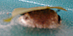 ヘンな蛾が羽化しました。繭をつくる際に、葉っぱを巻き込んだヤツです。蛹の時期は、実に21日間にも及びました。これはたぶん、繭の中での、前蛹の時期が長いのだと思います。蛾の名前は分かりませんが、幼虫のトゲ、繭の形態、成虫の姿からみて、イラガの一種ではないかと思います。イラガは繭の中で前蛹のまま冬越しするそうです。