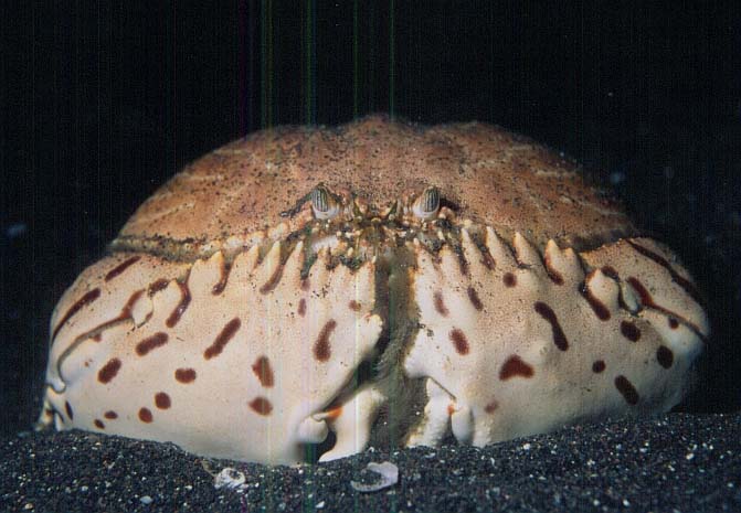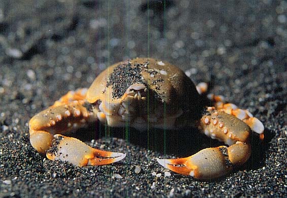 カニ。大きく平ったい手(ハサミ)でいつも顔を隠して