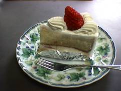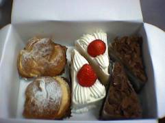 2002年5月4日(土) ケーキショップ ボン・マルシェ 田園都市線 池尻大橋駅 20分 世田谷区池尻1−7−9 3413−5979 13周年記念セール価格 イチゴショート 200円 チョコレートケーキ 150円 シュークリーム 100円 2個ずつ購入 支払い金額 945円 コメント イチゴショートのスポンジは混ぜ物が 入ってない素朴な味わい。 大きくないのでちょっとケーキが食べたい時向き。 チョコレートケーキも小ぶりで昔食べた懐かしい味。 チョコが甘すぎず、さっぱりしている。 シュークリームも懐かしさを感じる。 イマドキの味でなく懐かしさを求める人向きのお店。 思い立って重量を測った。 シュークリームは70g チョコレートケーキは60g 一日にケーキ類を3個も食べてしまった・・・。