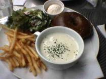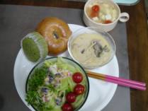 5月8日(水)の朝ごはん。ベーグル、サラダ、カレー、豆腐とトマトのスープ。朝から辛い!よもぎパンは食べ切れなかったしベーグルも半分。 |