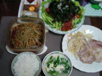 5月6日(月)これが、今日の夕飯です。カレーの香りに囲まれながら豚肉ステーキガーリック油焼き。海草サラダ、きんぴらごぼう、ニラ卵すーぷ。半額で買ったナムルセットは出したけど食べられなかった。 写真では分かり難いけどレタス、80gはありますよ。 |