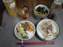 5月7日(火)のお昼。またまた、ナムル丼。冷奴、おかかがけ、きんぴら、海草。あとは自慢の手作りポン酢。同じ献立が重ならないようにと思っても、なかなかねえ・・。特に自分だけのご飯となると、気合は入らない。 |