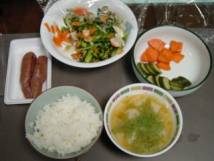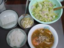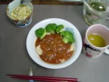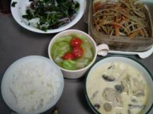 5月7日(火)の夕飯。ごはん、カレー、きんぴら、海草サラダ、レタスとトマトのスープ。カレーは辛いよ! |