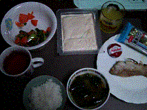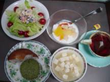 5月8日(水)の昼ごはん。朝、ベーグル半分しか食べられなかったから昼に食べた。豆腐スープ、サラダ、フルーツヨーグルト。紅茶。 |