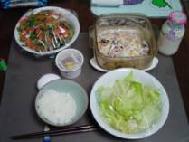 5月9日(木)の朝。飲んだ朝なのにモリモリ食べる。卵と納豆かけご飯、レタスサラダ、ビーンズサラダ、浅漬け、牛乳。 |