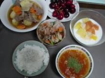 5月9日(木)わあい今日の夕飯は肉じゃがだ!って私が作った。メークイーンだと煮崩れしないから好き。ミネストローネスープと私が乾燥させたパセリ、浅漬け、アメリカンチェリー、フルーツヨーグルト。ご飯にはシラスがかかっています。 |