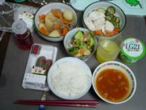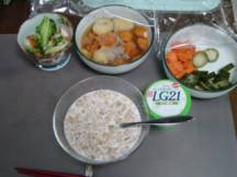 5月10日(金)朝ごはんからしっかり。ご飯、残りのミネストローネ、半額のたらこ、肉じゃが、自家製糠漬け、浅漬け、パイナップルジュース(これも半額)出したけど食べられなかったヨーグルト。宅配の明治プルーンジュース。 |