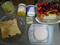 5月11日(土)朝ご飯。今日は北里のバイト。しっかり食べて出かける。レーズンパン、ハム、ビーンズサラダ、ヨーグルト、パイナップルジュース、 |