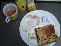 5月12日(日)レーズンパン、ハムエッグ、クリームチーズ、パイナップルジュース。 |