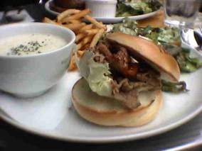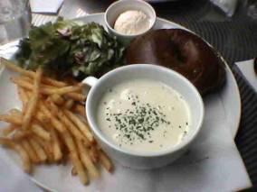 2002年5月6日(月) マコーズベーグル 11時 Aランチ750円 Bランチ700円 目黒区東山1−1−6 平日9時半から22時 土日9時から22時 ランチタイムは11時から14時 コメント 初めてベーグルを食べたのがこの店。 近くにプロダクションなどがあり 平日はえらくファッショナブルな人たちが 入っているが、休日は就学前の子供、乳幼児連れが半数を占め 無法地帯と化する時が・・。(フォーク投げたり走ったりの意) お持ち帰りもできるので、店内を見回して決めるのもいい。 Bランチのクリームチーズはたっぷり付いていて嬉しい。 スープはクノールのクラムチャウダー缶と同じ味のような気がしたが、ここの自家製なのだろうか? ここのポテトが好き。 お水をつぎにきてくれました。 ベーグルは目の詰まったパンて感じなので、虫歯の治療中には絶対お勧めできません。