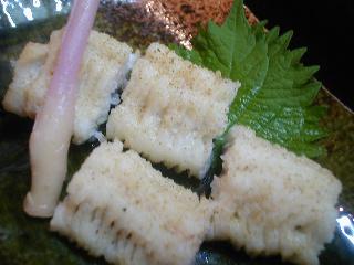 鱧の白焼き 山椒が、かかっています。何も付けずにこのままでもおいしいです。 |