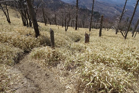 レポート: 夏へ向けてのトレーニングの一環で大菩薩嶺から牛奥ノ雁ケ腹摺山への縦走コースに行くことにしました。 おまけにまだ上日川峠までは車で行けないので丸川峠分岐駐車場を利用。そのため結構なロングコースになりました。 ここに行くからにはやはり富士山の展望は欠かせません。天気予報も晴れマーク1つでバッチリ。展望も期待が持てます。 朝6時前に丸川峠分岐駐車場に到着。 平日もあってか、まだまだ駐車場には余裕がありますが、続々と車が入ってきます。さすが人気の山です。上日川峠まで車で入れない季節でも、これだけ登山者がいるものですね。 それでは出発! 出発時間もほぼ同じの方と、休憩のたびに抜きつ抜かれつ登っていき、丸川荘に到着。 この写真の奥の方に小屋があります。 今日は昼間は平地で25度くらいまで気温が上がるようですが、朝はまだまだ霜が降りるほど寒いです。それでもここまでの登りで体が温まり半袖Tシャツで登っていたのですが、今日はさらに風も強く、休憩時はさすがに着こみました。 大菩薩嶺へと登っていくと残雪が出てきました。まだ日中のように溶けるほど気温上昇もしておらず、ザクザクと登れるのですが、時に踏み固められて氷になっている箇所も。木の根や石が露出している箇所を見つけながら、それでも滑りながら登ります。残雪がない箇所も多いので、結局チェーンスパイクは付けずに進みます。 そして早くも今日の最高標高地点、大菩薩嶺に到着。今日は雲取山登山のときの反省を生かし、快調に行けそうでもスピードを抑えながら登りました。そのためかほとんど疲れも出ずここまで来れました。 ですが今日はここはまだまだ序盤。これからまだまだロングコースが待っています。 展望のない大菩薩嶺から雷岩まで移動してきました。 そして定番の富士山の眺め!天気は文句なしの快晴!でも空は春っぽく白くて、富士山はくっきり見えているものの背景に同化して見えづらく。ちょっと残念。 これから進む縦走ロード。妙見ノ頭や小金沢山、中央奥あたりが牛奥ノ雁ケ腹摺山でしょうか。 この付近、雪解けによる泥濘がひどいです。避けて進むと植生を傷めるし、仕方ないので泥濘にはまって靴が泥で重くなりながら進みます。 縦走中、大菩薩嶺方面を振り返って。 大菩薩峠。休日は混雑しているこの場所も今日は自分一人。介山荘もまだ開いていません。平日だからでしょうか。 右が小金沢山。 小金沢山目指して笹原を進んでいきます。 振り返るとこんな感じ。 なぜこの山域はこんなに笹原が多いのでしょう。 小金沢山の登りではまたカチカチの残雪が出てきました。こっちのほうが急登で面倒でした。 小金沢山到着! 富士山、写真の中央にあるのですが、より一層空は白くなり肉眼でも気づきにくくなっています。写真ではもはや写っていないに等しい。 さて、最後のピーク、そして今日の目的地の一つである牛奥ノ雁ケ腹摺山へ向かいます。 大きな起伏もなく牛奥ノ雁ケ腹摺山に到着!相変わらず富士山は見えるのですが写真を載せても仕方ないくらいに判別不能です。 長い縦走も終わり、日川林道目指して下り始めます。 この辺りは枯れ木が多い。 枯れ木の間からはこれまであまり見えなかった奥秩父方面の山々が。 下りの途中では大菩薩嶺方面も見えます。起伏を越えながらも随分遠くまで来たものです。 日川林道に着きました。 これは日川林道から牛奥ノ雁ケ腹摺山に向けての登山口。 ここから長ーい林道歩き。 舗装道路の歩きは危険。長いこと歩いてきてふやけ気味の足裏に水ぶくれができ始めます。 痛いし、これ以上ひどくならないようにかばいながらになり、まともに歩けません。 そしてアスファルトからの照り返しの暑さ。 舗装道路に耐え切れなくなり、計画の登山コースから外れて上日川峠方面のショートカットルートを進みます。 地図では破線ですが、整備されてものすごく歩きやすいです。 上日川峠到着。 本来のコースに戻ります。 千石茶屋到着。平日は休業です。 そして丸川峠分岐駐車場ゴール! 富士山の展望は薄いものの、快晴のもと登山を楽しめました。 スピードをコントロールできたせいか、疲労はあるものの終始快適に歩けたのも良かったです。 帰りの温泉はすぐ近くにある大菩薩の湯に。少しつるつるした泉質か、床も少し滑り気味。湯温はちょうどよく、疲れた体を癒すことが出来ました。 見かけた草花: サンシュユ ミツバツツジ ミネザクラ