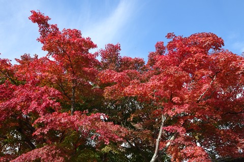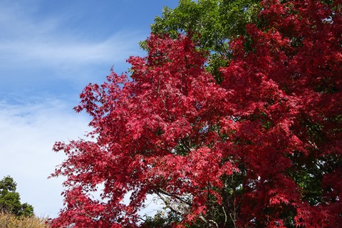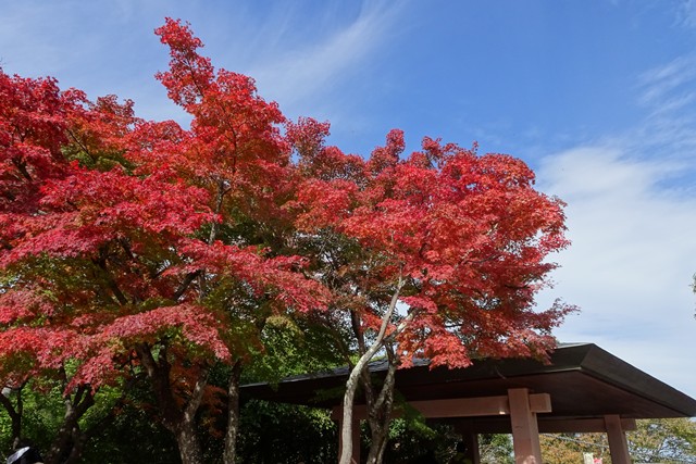 高尾山山頂部の東屋付近のモミジ。鮮やかな紅葉。 登山日:2025年11月2日 天気:曇り時々晴れ コース: 総タイム 3時間25分