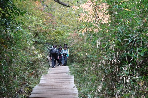 レポート: ここのところ、東京の週末はずっと雨続き。先週7週連続と報道されていたので、昨日の土曜日の朝にも雨が降っていたから8週連続になったのでしょう。 それでも今日の日曜日は晴れと曇りの天気。 はじめはあきる野市の刈寄山を考えていたのですが、ここのところ麓にまで下りてくるクマの目撃情報が怖いので行き先変更することに。 次は美し森山を考えてたのですが目当ての電車の予約がとれず、その他で行くと到着が午後になるので却下。 続いて三浦半島の岩礁の道を計画しましたが、風が強いので波が荒れると判断し、直前で止めました。 そして最終的に高尾山に確定。今年は2回目です。激混みになるだろうから電車で行くことにし、温泉にも入りたいのでザックに着替えを詰め込んで来ました。 高尾山口駅には10時前に到着。やはり混雑。 天気はこんな感じ。でも高尾山のほうはあまり青空はでていません。富士山を見るのは難しいかなと思いつつ、準備して出発です。 今日は登りは稲荷山コースです。ケーブルカー乗り場の脇がコース入口。 このコースのほとんどは階段が整備されています。 多くの登山者が通りますから、踏み付けでコースが荒れないように整備しているのでしょうか。 稲荷山山頂の展望台まで来ました。ここが山頂とは気づかず、山頂の標識もあったようなのですが見過ごしました。 展望は東京都心方面が開かれており、東京スカイツリーも目視できるほどでした。 階段もずっと続きます。 高尾山の山頂部に出ました。いきなりの大賑わい。出たところがちょうど富士山の展望の場所でした。 雲が多いですが、いつもの富士山の展望。見ることができて良かったです。 山頂標は写真待ちで行列。 東屋付近ではモミジが鮮やかな紅葉! 真っ赤なモミジ。少し期待していたのですが、紅葉を見ることができて良かったです。 そして下りは1号路。薬王院付近では停滞するくらいの登山者の渋滞にあいながら、高尾山口駅に戻りゴール! 高尾山は激混みでしたが、それだけにここのところ全国で急激に増えているクマによる被害をほとんど心配することなく、安心登山を楽しめました。 今日は電車移動だったので、温泉の準備はザックに詰め込んできました。 温泉はもちろん京王高尾山温泉極楽湯。高尾山の混雑具合から想像できますが、温泉も混雑。どの湯も入り込めないほど混んでいましたが、隙間ができたところを狙って浸かり、どうにか温泉を楽しめました。 見かけた草花: シラヤマギク