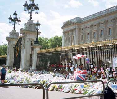 バッキンガム宮殿前の献花群・・・ダイアナ元妃へ