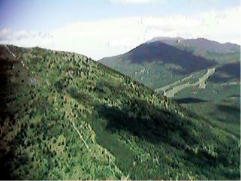 「湯の丸山」を振り返ると、写真のように降りてきた道が一筋良く見えます、その背後には湯の丸スキー場のゲレンデが見えています。
