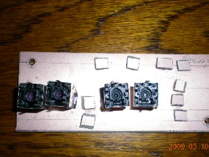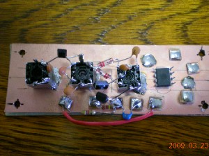 まずVXO部の基板にランドとFCZコイルを付けました。手先が不器用なので整然とはならず不格好なってしまいましたが仕方がありません。特にFCZコイルのシールドと基板の半田付けが慣れていないせいもありもたつきました。それとランドを生基板から切り出す作業が結構大変で、はじめはうまく短冊が切り出せませんでした。プラスチックカッターの使い方がまずかったのと、短冊を長くしすぎてペンチで折るとき途中で割れてしまうという現象に悩まされました。「本」にあるとおり5センチ程度にすべきでした。 (2009/3/10) ![]()