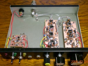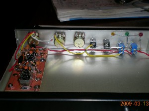 JF1RNR今井さんの「ランド方式で作る手作りトランシーバ入門」の中にある144MHzCWトランシーバを作ってみようと思います。最初にケースに穴あけ加工してボリュームなど部品を取り付けます。外観的には完成ですが中は空っぽ、これから順次ブロック単位で作っていきます。 VXO部を最初に作り、機能することが確認できたら受信部、次に送信部の順でいこうと思います。(2009/2/4)